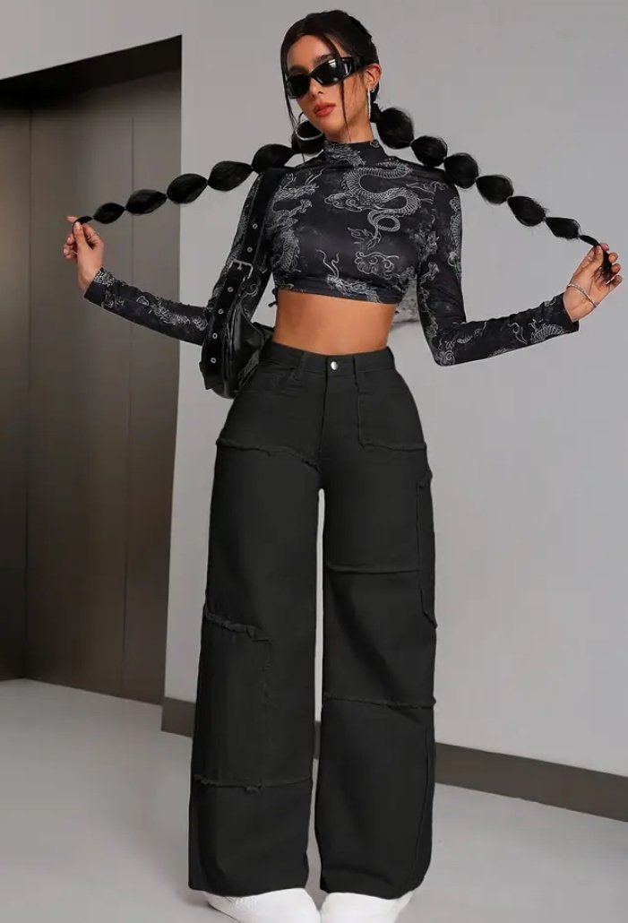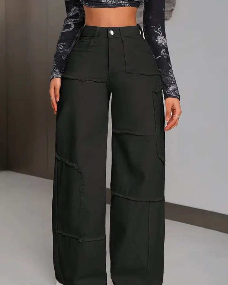 Women'S Mid-Rise Stretch Denim Wide-Leg Pants - Asymmetrical Knee-Length Fringe Detail, Loose Fit Distressed Jeans for Casual Streetwear, All-Season Comfort, Versatile Clothing, Raw Edge Construction